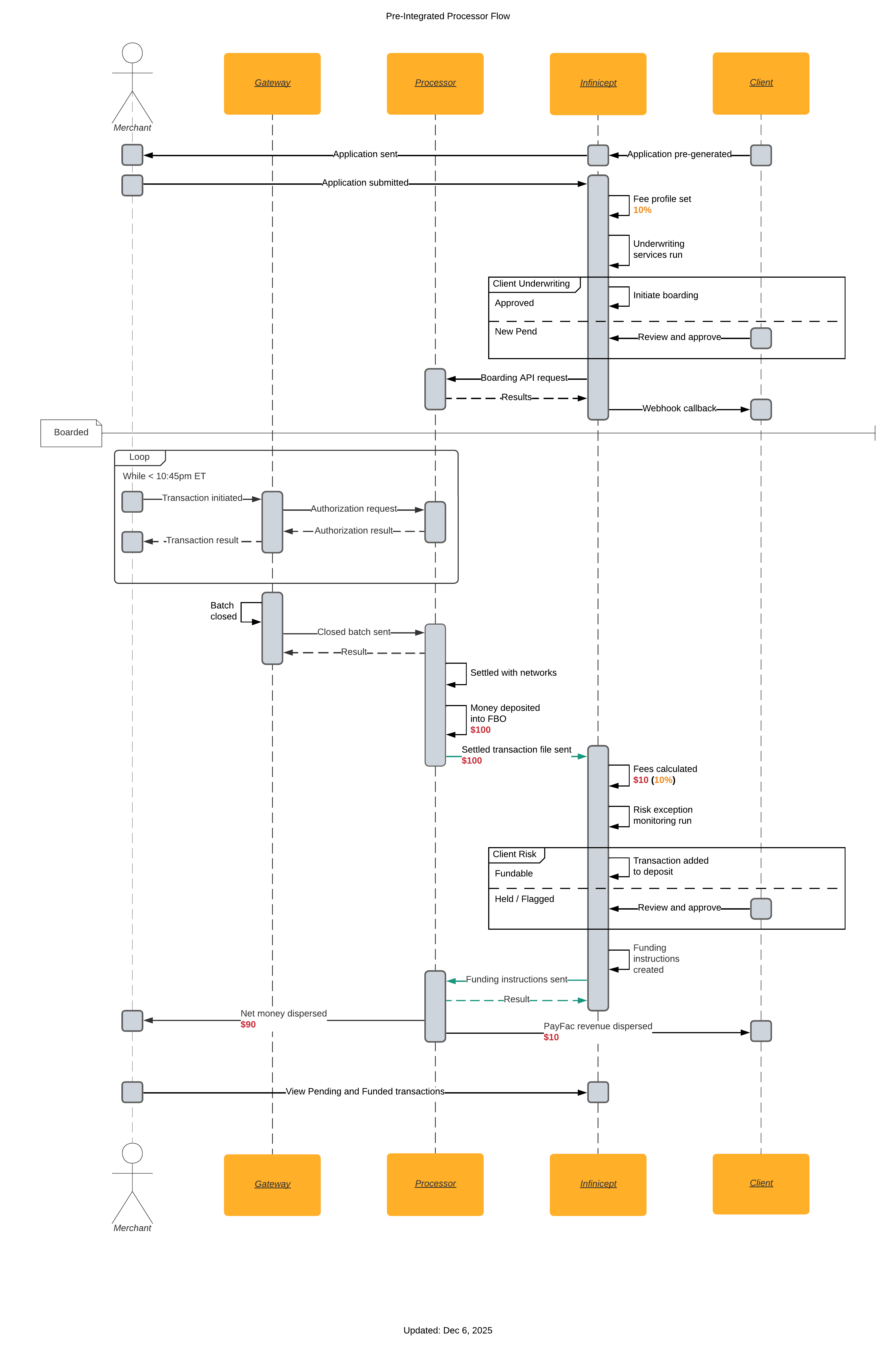 Pre-Integrated Processor Flow Infinicept Apr 25, 2022 2:00:21 PM Infinicept is pre-integrated to multiple processors, to allow for a fast and streamline process for Boarding, Transaction Importing, and Funding. Enabling the Payment Facilitator to quickly enable the program. Flow Diagram